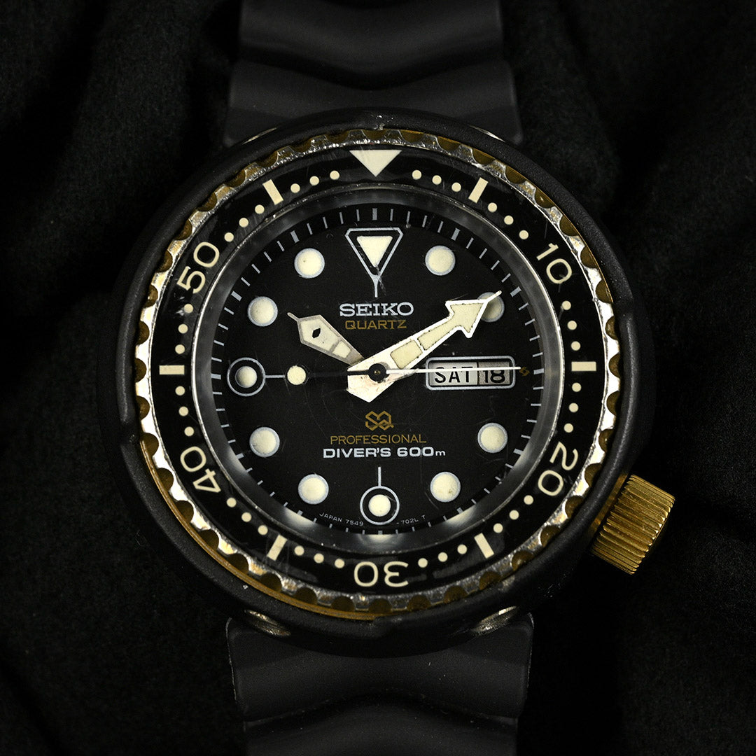 We are genuinely thrilled to offer this Seiko “Golden Tuna” 7549-7009, an icon in the world of professional diving watches and one of the rarest and most collectible Tunas ever produced. Launched in the late 1970s as Seiko’s first quartz saturation diver, the 7549 series already has serious pedigree — but the gold-plated titanium shroud version was produced in far smaller numbers, making surviving examples remarkably scarce. Collectors absolutely hunt these down.