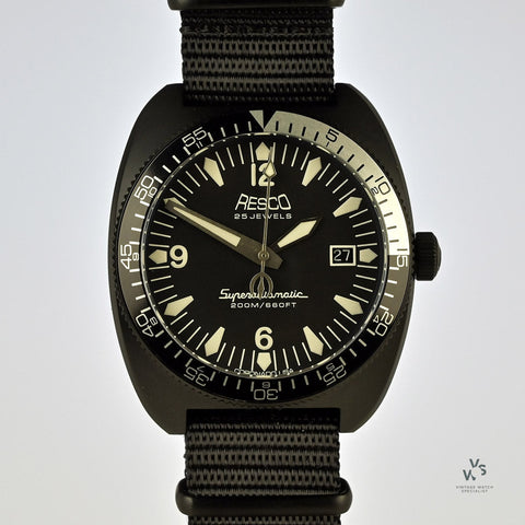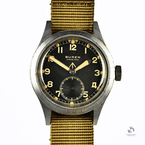 This watch is in beautiful vintage condition with a stunning two-tone dial in black and tropical chocolate brown. This watch is not dissimilar in style to the military-issued watches of the time with bold Arabic numerals and sword hands. The original ume is still present in the hands and has aged to an attractive pale lemon colour and there is also an outer seconds track present. This is a mid-size watch at 33mm but it is rather robust and wears well on the wrist. The dial is encapsulated underneath an acrylic crystal and encased in stainless steel and boasts matching case and lug numbers which is very rare. The leather strap with contrast stitching brings out the chocolate on the dial and really adds warmth. A beautiful vintage watch from an iconic watchmaker.