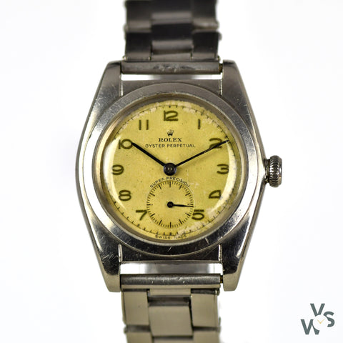 1950’s Rolex – solid 9k Gold ‘Dennison’ 30mm case, produced in Birmingham (confirmed as per hallmarks). Beautifully aged vintage dial with an interspersed array of Arabic numeral and arrowhead hour markers. There is a mild, yet deep golden tone to the watch on the dial where the original radium in the hands has matured slowly. These marks are most prominent at 8.20 where the hands had stood still for many years while the watch sat unused in a sock drawer, though we see this as an enhancement, not a defect to the watch’s aesthetic and testament to its fantastic condition not having been used for many years.
